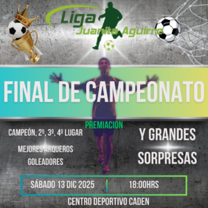 | Amigos de la Liga Juanita Aguirre. Queremos invitarlos este sábado 13 de diciembre al cierre y premiación de nuestro Campeonato Oficial 2025, actividad que realizaremos en el mismo recinto, una vez finalizados los partidos. Será una instancia para celebrar juntos todo lo que construimos durante el año: esfuerzo, compromiso, compañerismo y buen fútbol. Nos encantaría contar con la presencia de todos para darle un cierre a la altura de nuestra liga. ¡Los esperamos con la mejor energía para compartir, reconocernos y disfrutar como la gran familia futbolera que somos! |