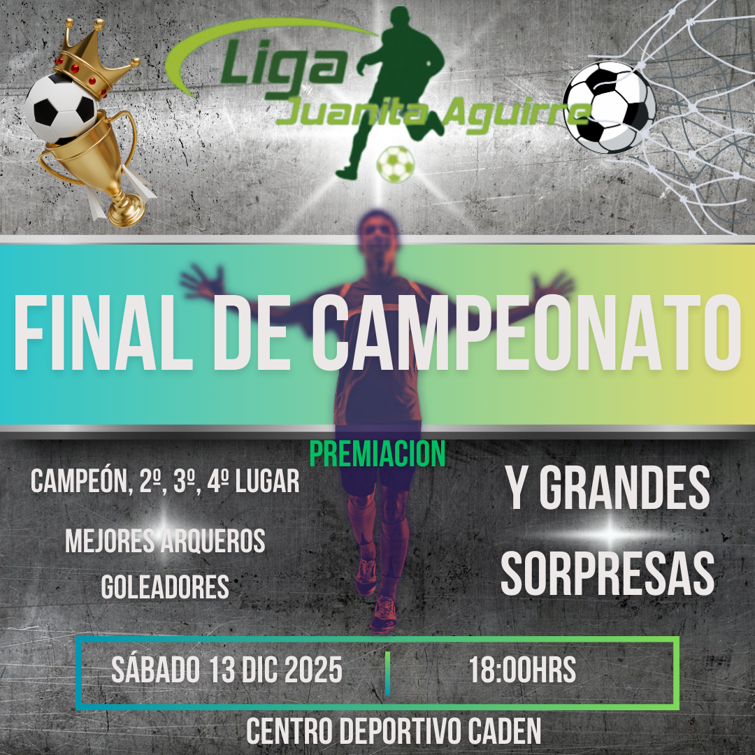 | Amigos de la Liga Juanita Aguirre. Queremos invitarlos este sábado 13 de diciembre al cierre y premiación de nuestro Campeonato Oficial 2025, actividad que realizaremos en el mismo recinto, una vez finalizados los partidos. Será una instancia para celebrar juntos todo lo que construimos durante el año: esfuerzo, compromiso, compañerismo y buen fútbol. Nos encantaría contar con la presencia de todos para darle un cierre a la altura de nuestra liga. ¡Los esperamos con la mejor energía para compartir, reconocernos y disfrutar como la gran familia futbolera que somos! |